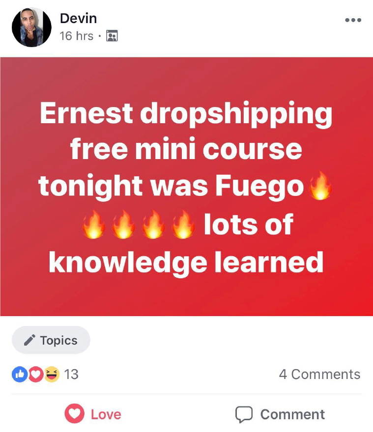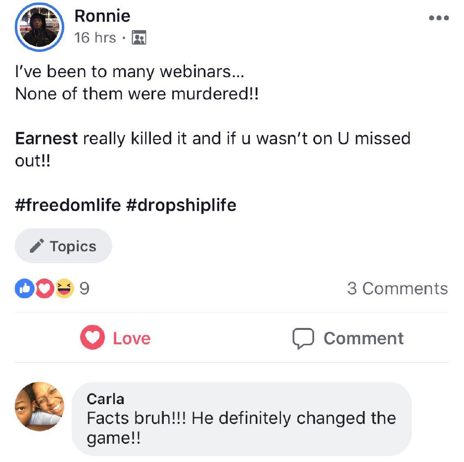 Earnest used to be a prisoner to the typical 9-5 cubicle life that most people live their entire lives pursuing but he was able to break those chains by figuring out all the hidden secrets of dropshipping. So, through very simple methods of building a dropshipping business, he's now able to run his businesses from home or anywhere in the world and spend time with his fiancée and four boys.